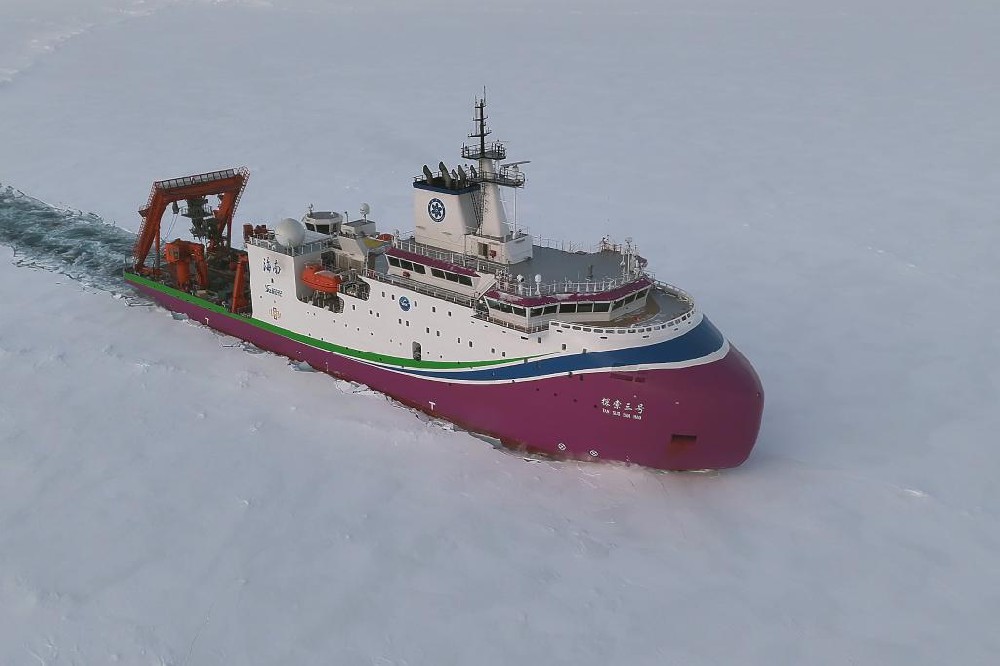 “探索三号”在北极密集冰区破冰航行。